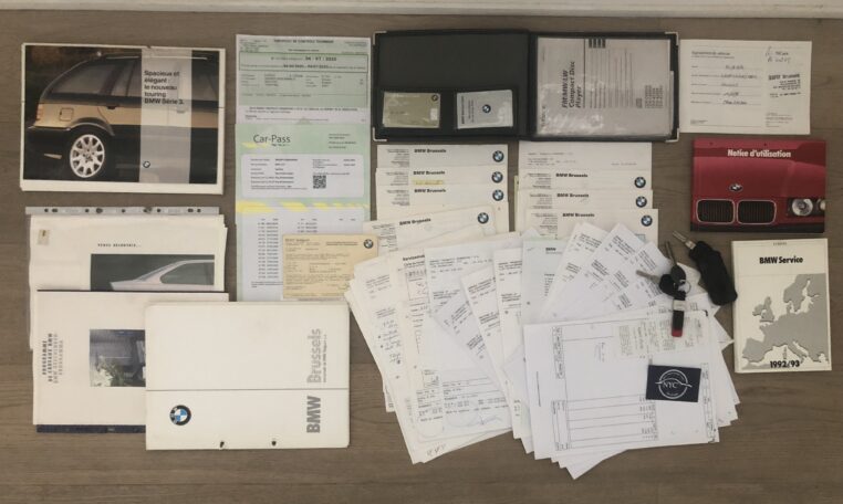 Nous avons tous les manuels, la farde en cuir BMW, le triple des clés BMW et même les catalogues d’époque avec les prix, absolument tout est complet…