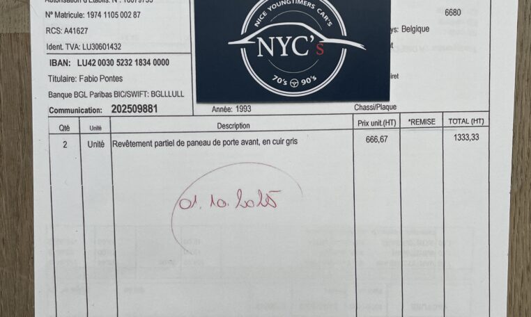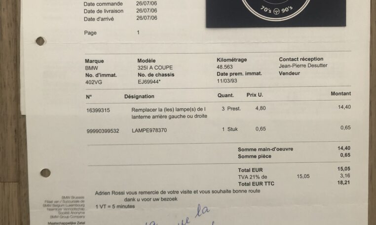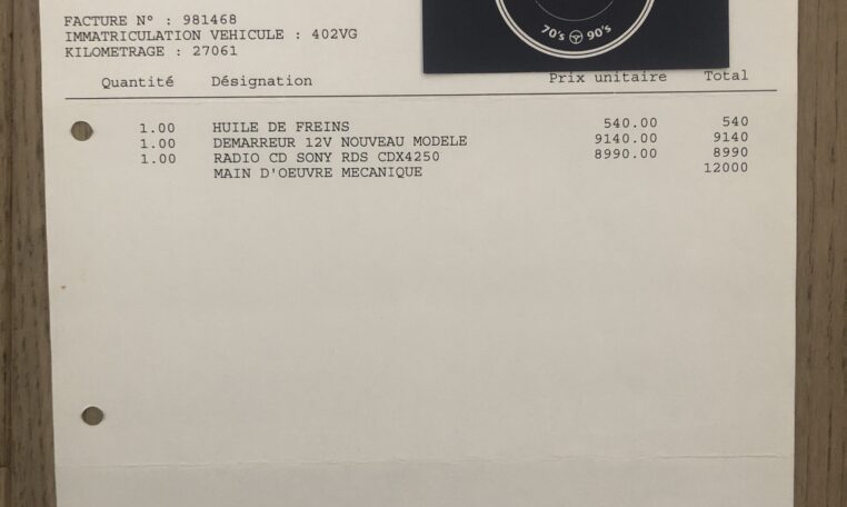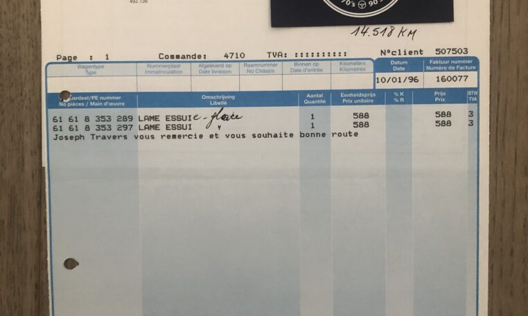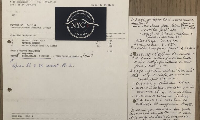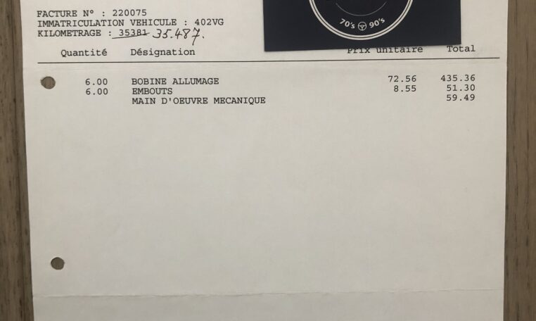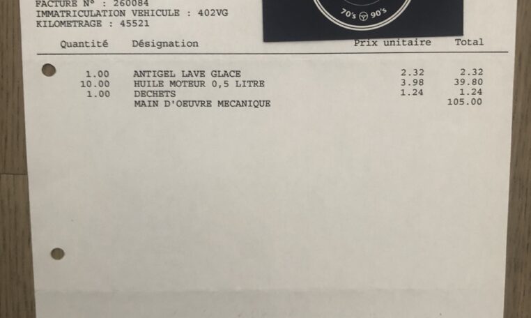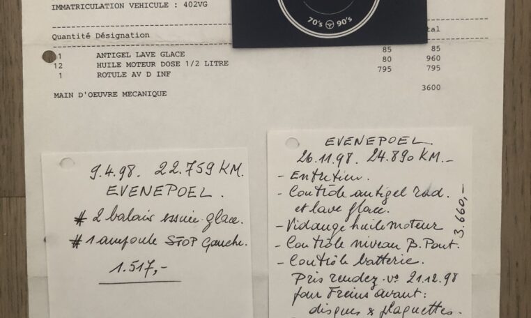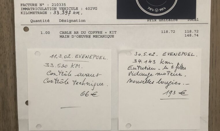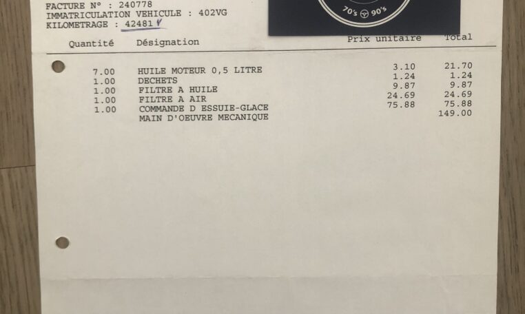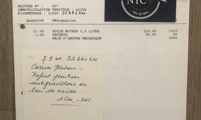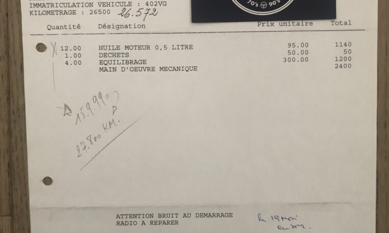 Assez dingue, mais nous avons TOUT l’historique de la voiture, des offres de la commande, au bon de commande, à la facture de la livraison, et surtout, le dossier complet des entretiens : un énorme dossier reprenant des dizaines de factures… Ce dossier nous permet, en plus du car pass, d’avoir une certitude sur son faible kilométrage.
