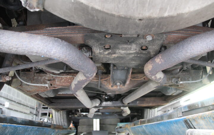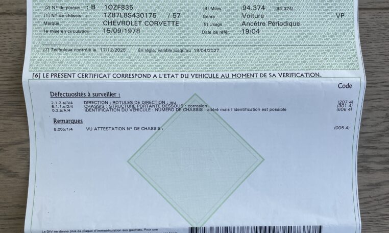 Le dernier contrôle technique a été effectué en décembre 2025 (94.374 ml au compteur) et ne mentionne que 3 remarques mineures : une rotule de direction, une présence de corrosion superficielle (bien que nous n’ayons rien vu sur le pont) et la demande de l’attestation du numéro de châssis, que nous avons bien entendu.