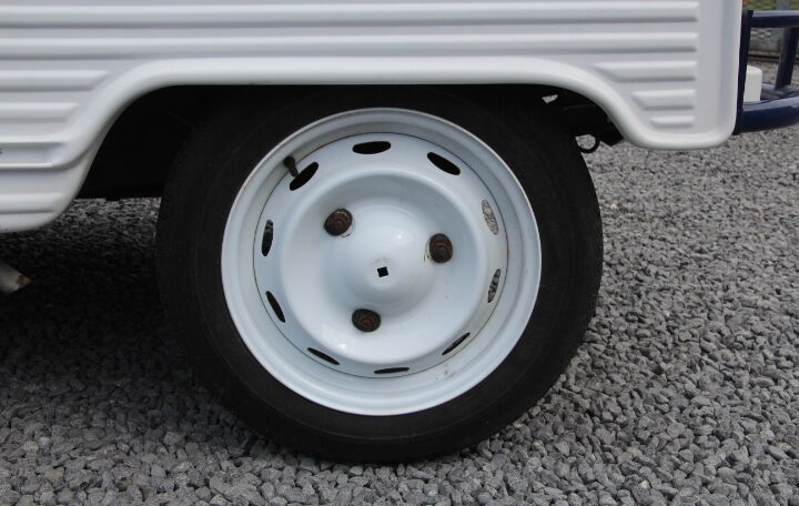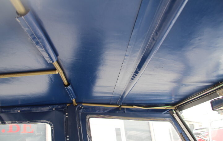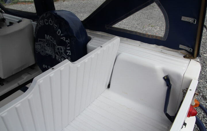 L’intérieur présente très bien aussi, que ce soient les sièges, le volant, les intérieurs des portes et surtout toutes les bâches de fermetures. Elle est également complète, entre autres avec sa roue de secours et donc toutes ses bâches.