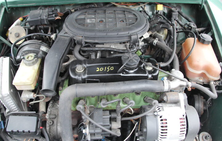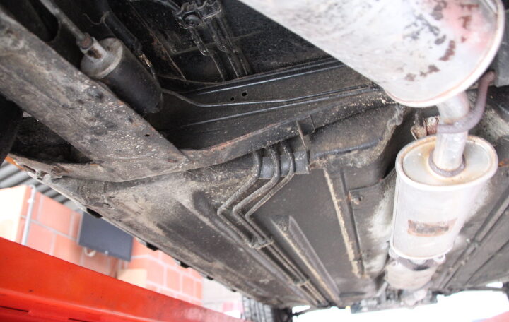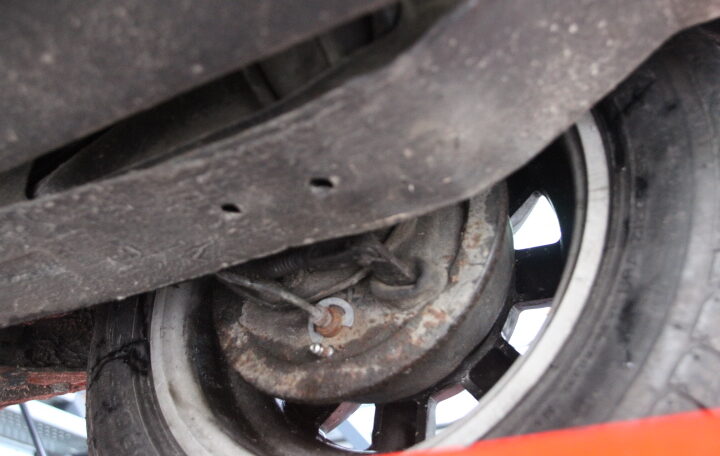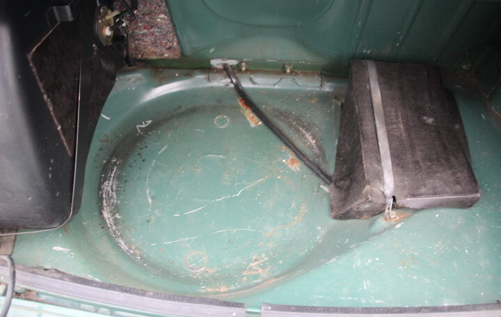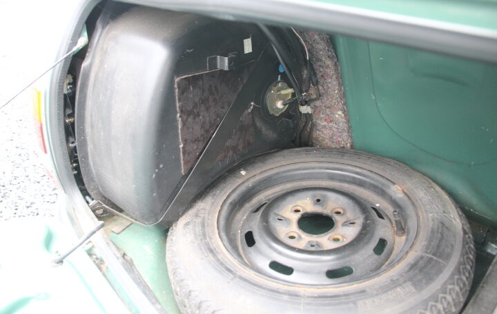 En ce qui concerne la carrosserie, elle présente bien (peinture complète effectuée en 2013). Nous n’avons pas vu de griffe, ni de coup ni de corrosion (voir photos prises sur le pont) excepté une fine trace de corrosion superficielle dans le plancher de coffre, sous la roue de secours (voir photo, c’est très léger).