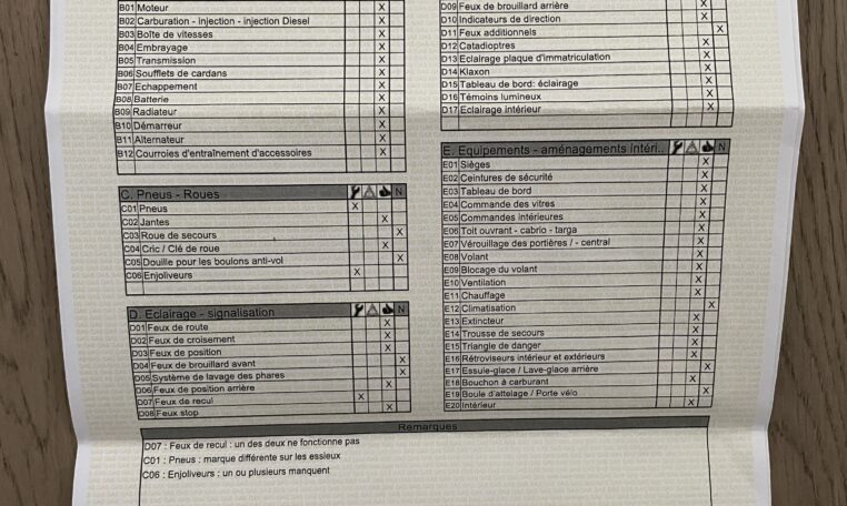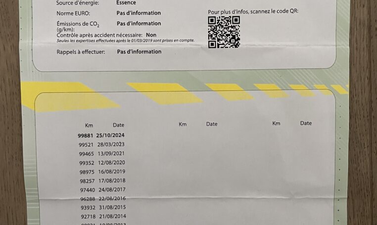 Le dernier contrôle technique date d’octobre 2024 (99.881 Kms) et ne mentionne que 2 remarques mineures : phare arrière et essieux.
