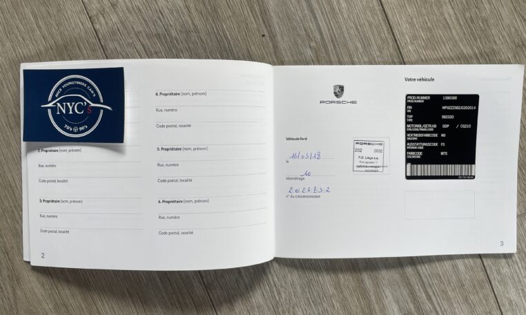 Nous avons également tous les manuels dont le carnet d’entretien, la farde Porsche en cuir, le double des clés, et tous les documents nécessaires pour une éventuelle exportation (COC).